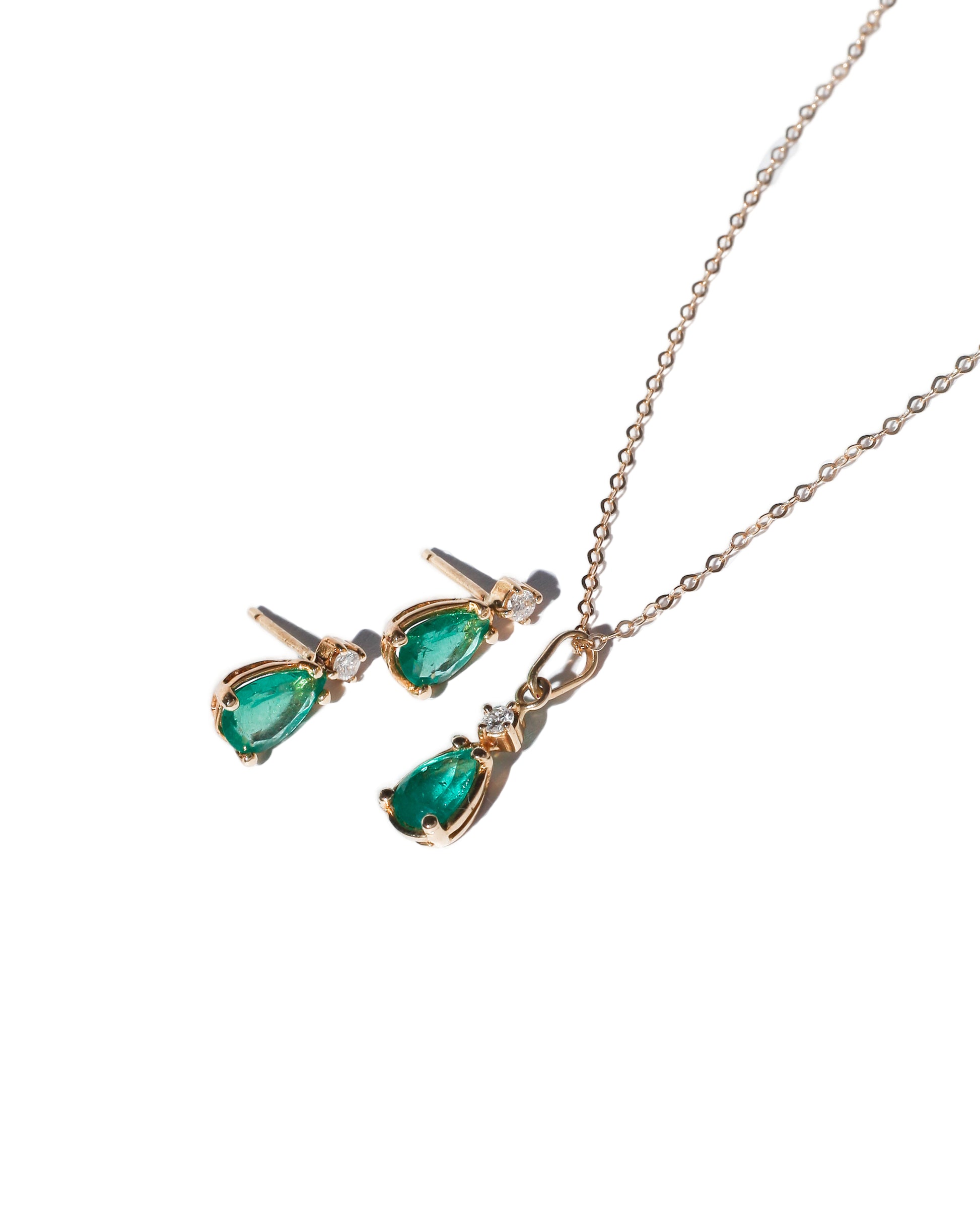 CADENA DE ORO EN CLIPS DE 1.34 GR, DIJE ESMERALDA TIPO LAGRIMA Y DIAMANTE DE 2.8 MM, ESMERALDA DEL DIJE 0.99 CTS, ARETES LAGRIMAS ESMERALDA DE 1.53 CTS Y DIAMANTES DE 2.8 MM, 2.92 GR DE ORO